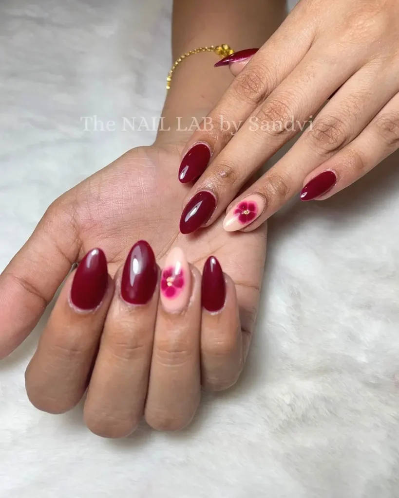 15. Glossy Wine Red Nails With Floral Accent Detail