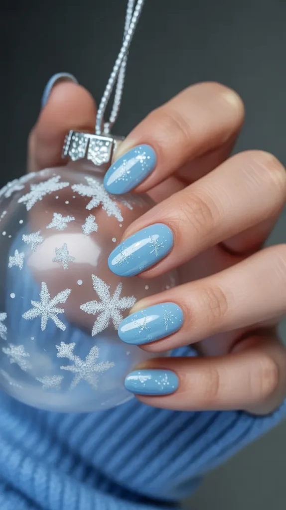 Icy blue almond nails bring frosty fairytale vibes to your fingertips. The micro-glitter sparkle mimics snowflakes catching the light, giving your winter nails a magical touch. Perfect for cold days and festive nights alike. ❄️
