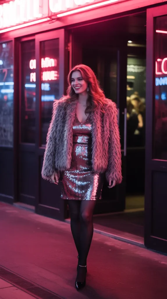 A sequin dress paired with a faux fur coat, tights, and heels delivers instant party energy. It’s warm, glamorous, and made for celebration nights. You’ll shine (literally) while staying perfectly comfortable the dream combo! 💖