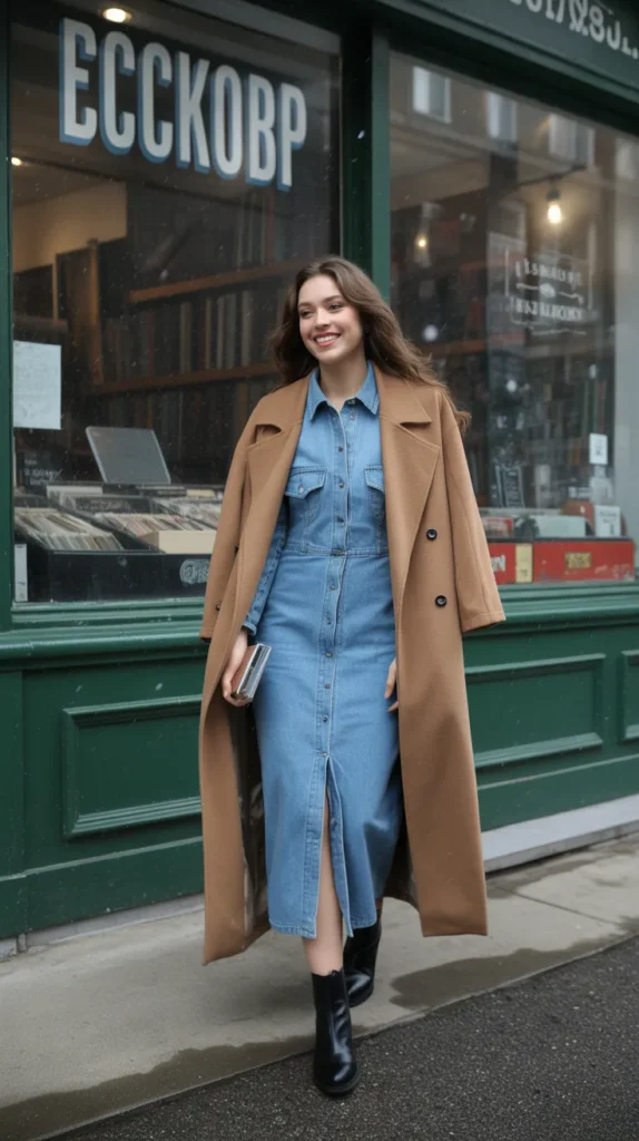 A denim midi dress with a longline coat and booties gives casual comfort a refined update. It’s simple yet stylish, perfect for lunch meetups or exploring winter markets 🎡.