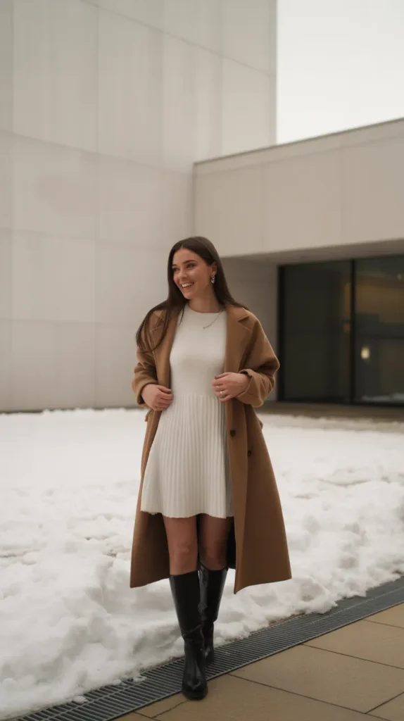 A white wool dress under a camel coat with knee boots feels fresh, clean, and absolutely dreamy. It’s timeless, sophisticated, and radiates that “chic in the snow” energy ❄️🤎.