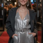 A pleated metallic dress with a tailored blazer and booties is your “I’m the star tonight” look. ✨ Structured, bold, and totally photo-ready it’s what dream clothes are made of.