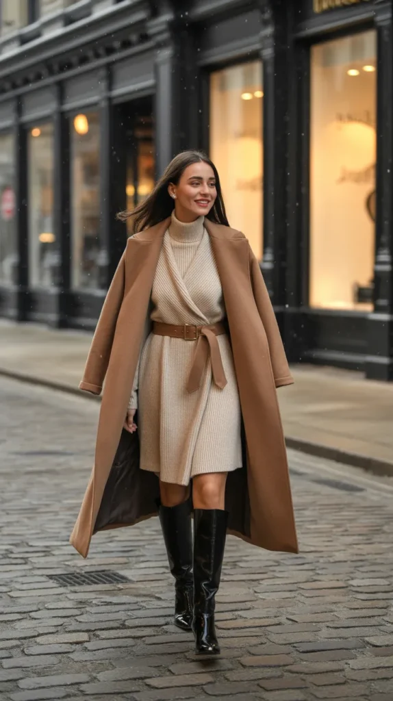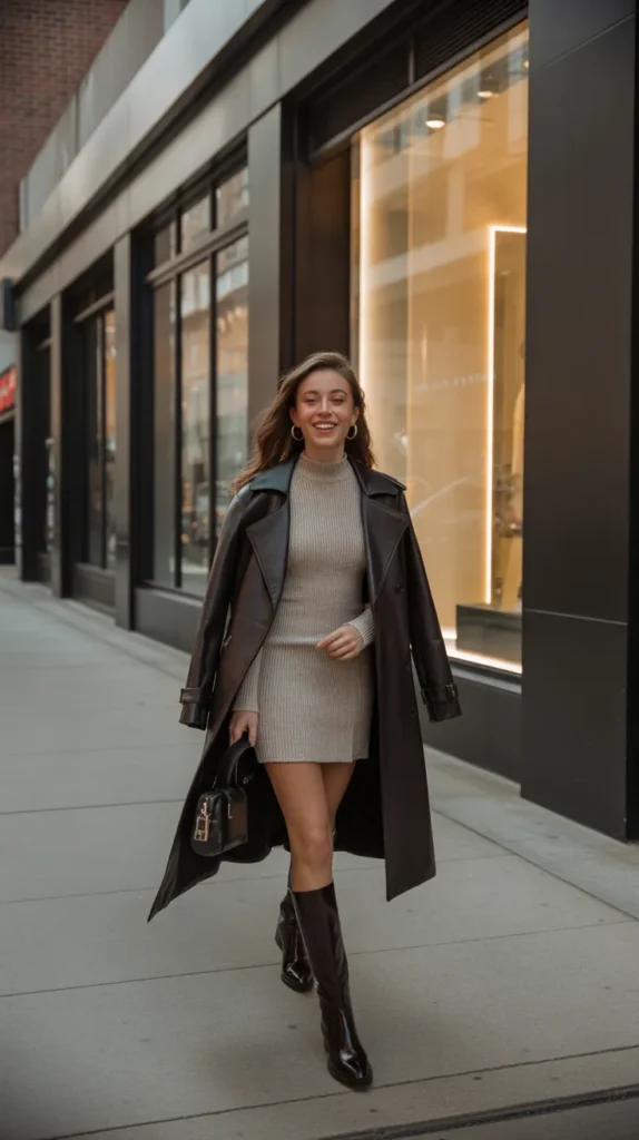 A ribbed sweater dress topped with a leather trench and knee boots makes a statement without shouting. It’s that “cool-girl elegance” kind of look effortless yet unforgettable.