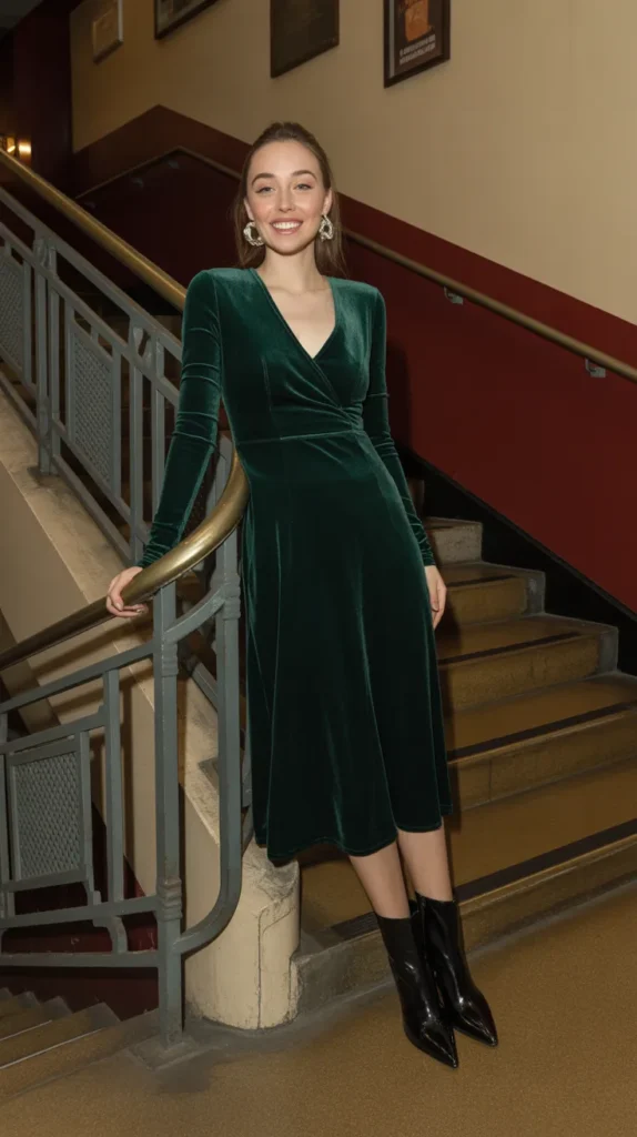 A velvet midi dress with statement earrings and heeled boots simple, elegant, and always flattering. This winter cocktail outfit screams confidence with every step.