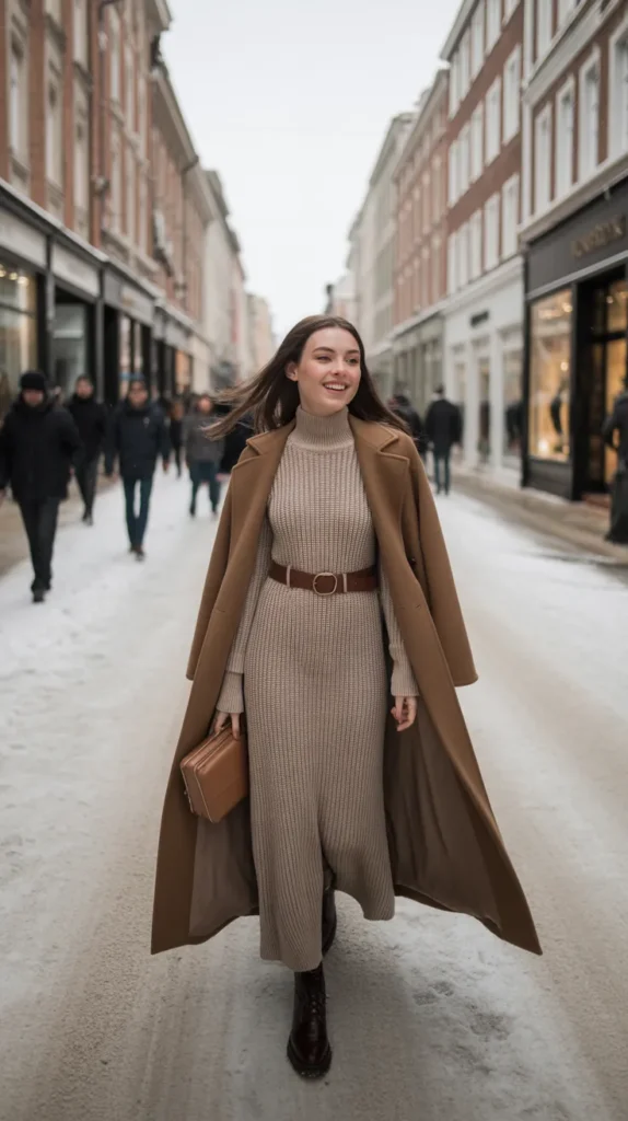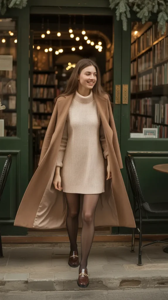 A sweater dress layered under a long coat with tights and loafers is comfy sophistication at its finest. It’s that “I look put together without trying too hard” kind of vibe ideal for coffee runs or casual Fridays ☕.