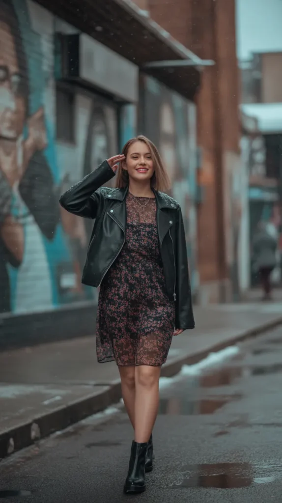 A floral long-sleeve dress under a leather jacket with ankle boots gives you that romantic rebel aesthetic. A little soft, a little tough 100% stylish.
