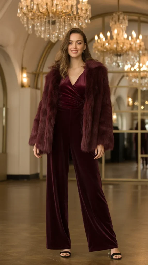The velvet jumpsuit dress hybrid with a faux fur coat and heels is a creative twist on the classic. It’s playful, unexpected, and perfect for modern celebrations that demand something extra.