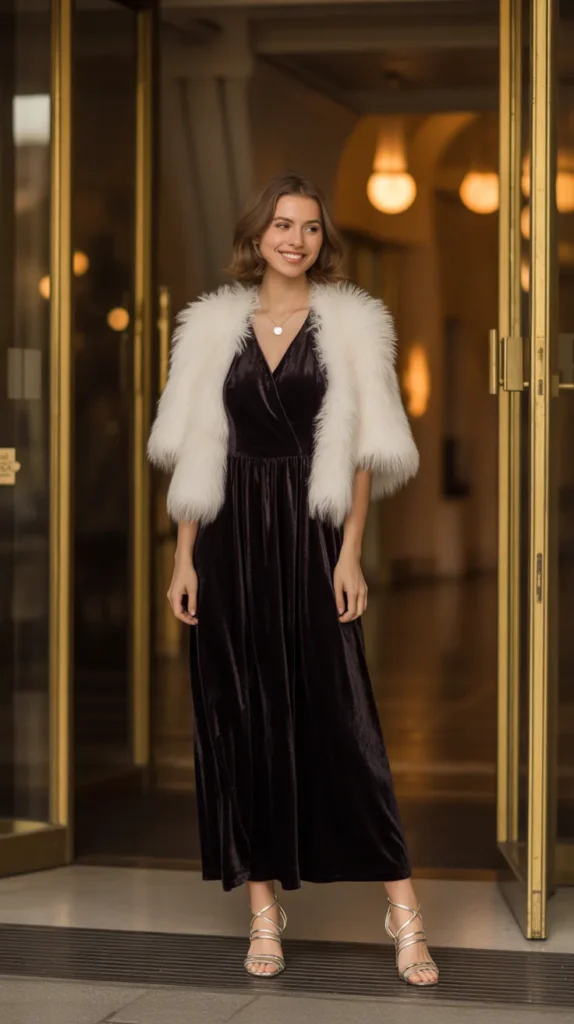 Nothing says “glam winter goddess” like a velvet maxi dress paired with a faux fur shawl and heeled sandals. It’s luxe, soft, and brings that subtle old-Hollywood energy. ✨ Perfect for formal nights when you want to look elegant and cozy.