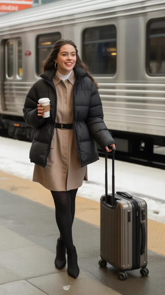 A wool-blend shirt dress layered with a belted puffer and heeled boots? That’s airport-to-dinner perfection. It’s cozy, functional, and chic enough for all your winter adventures.