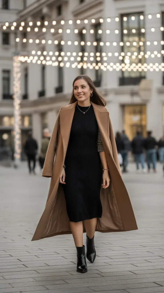 A black knit midi dress with a long camel coat and ankle boots? Absolute perfection. This timeless combo is the definition of “quiet luxury.” It’s the kind of winter outfit that takes you from meetings to dinner without breaking a sweat or style stride.