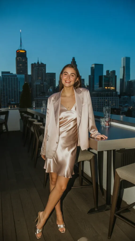 The satin slip dress meets its match with a cropped blazer and heeled mules. It’s sleek, minimal, and so chic. Perfect for when you want to impress with a hint of “I didn’t even try.” 😉
