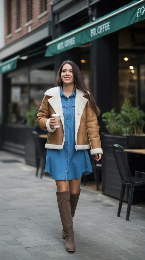 A denim shirt dress with a shearling jacket and knee boots? Cozy, cool, and totally city-date approved. Add statement earrings or a bold scarf to elevate this casual winter outfit from cute to chic.