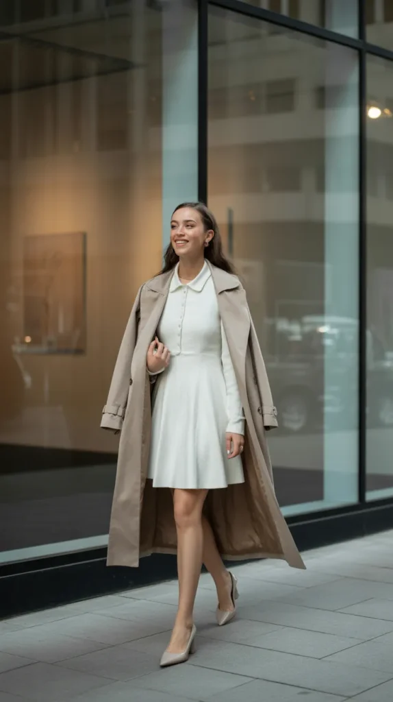 A white wool dress styled with a trench coat and neutral heels feels fresh, pure, and oh-so-elegant. This winter outfit is made for minimalists who love clean lines and timeless sophistication.