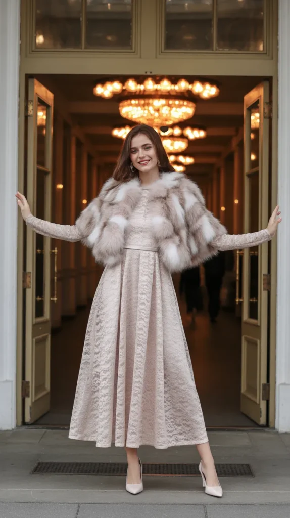 A lace long-sleeve dress paired with a faux fur cape and heels is straight out of a fairytale. 💕 It’s romantic, warm, and absolutely perfect for weddings, holiday parties, or just feeling fancy on a Tuesday.