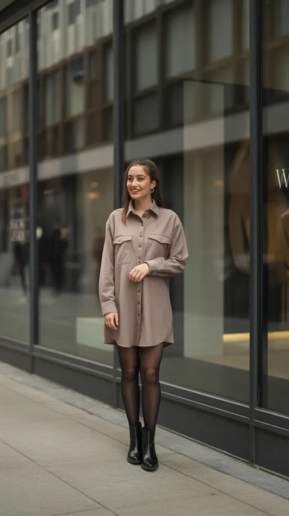 A wool-blend shirt dress paired with tights and ankle boots nails that refined, professional winter vibe. Great for office days or coffee catch-ups. Add a belt for extra shape or a bold coat for personality.
