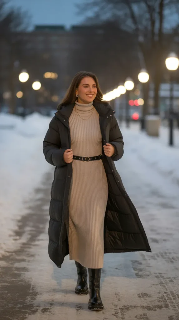 A sweater maxi dress under a belted puffer with knee boots brings together comfort and sophistication. It’s ideal for busy winter days when you still want to look polished because even your cozy moments deserve style. ☕