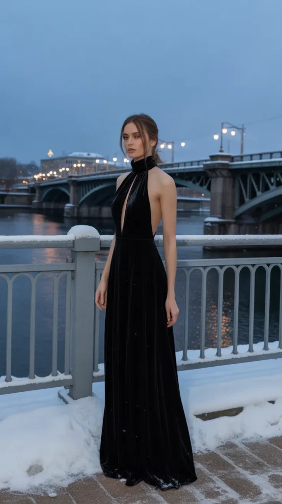This winter formal dress is pure drama in the best way. The high neckline and rich velvet texture give it old-Hollywood elegance. Ideal for black-tie events where you want to stand out subtly but powerfully.