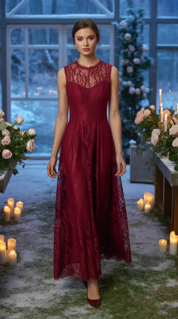 11. Wine Red Lace Dress with Illusion Neckline