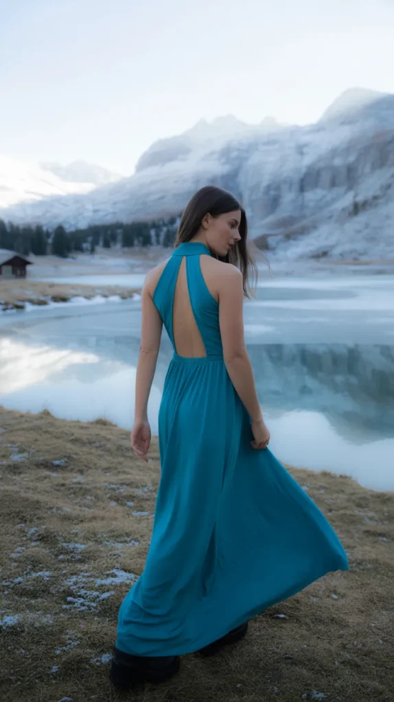 This flowing teal gown radiates confidence and modern grace. The halter neckline and open back make it feel fresh yet timeless. Itβs a winter formal dress thatβs equal parts powerful and poetic.