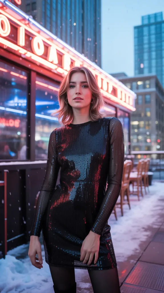 Playful yet posh, this frosted mini catches light like an icy disco ball. Itβs a go-to pretty dress for festive nights out, blending fun and high fashion. Pair it with clear heels and a sleek updo for modern charm.