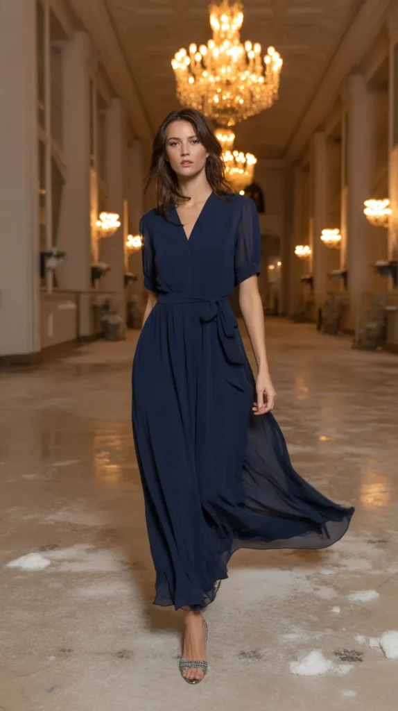 4. Navy Chiffon Maxi Dress with Waist Tie
