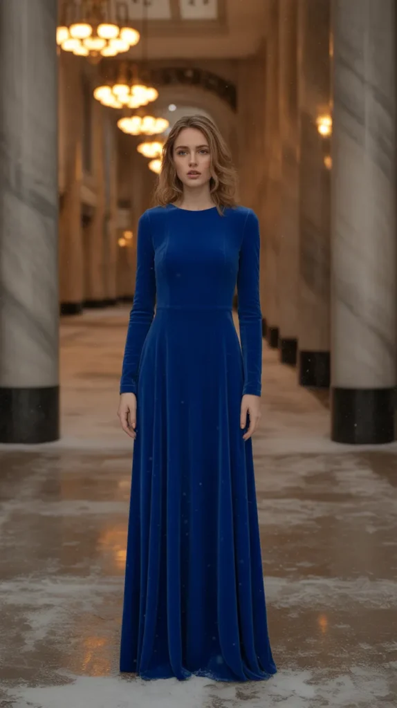 Velvet takes center stage in this rich royal blue stunner. The fitted cut gives it that regal silhouette while keeping you warm through chilly evenings. One of those winter formal dresses that turns heads from every angle.