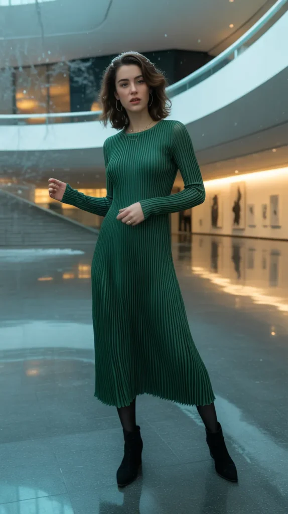 9. Forest Green Pleated Midi Dress