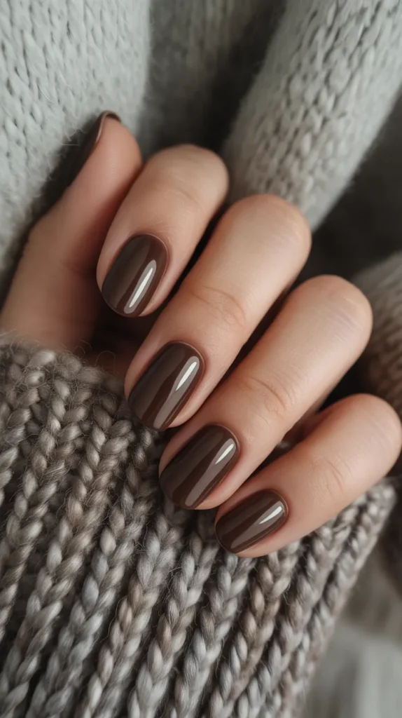 Chocolate brown gloss nails are pure comfort in color form. The deep, warm tone adds richness, while the gel coat gives them that smooth-as-glass shine. Ideal for winter gel nails ideas that feel cozy but still sophisticated. ☕