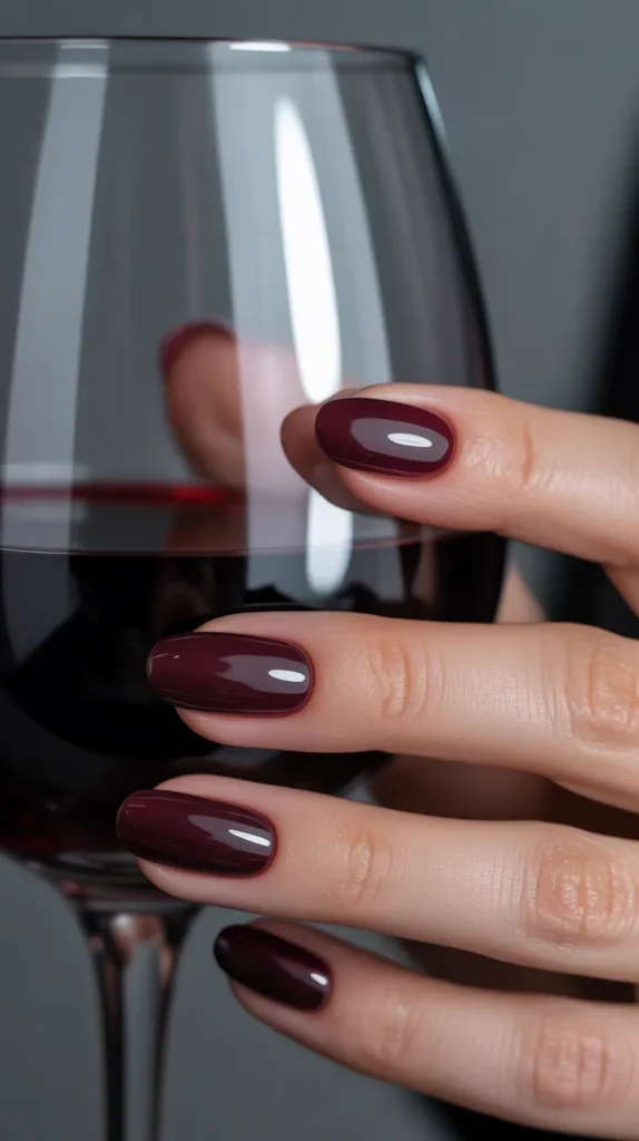 Burgundy wine gel nails radiate holiday confidence. The sleek, glossy finish gives major “classy evening” energy while still staying timeless. Perfect for winter nails lovers who want a rich, romantic color. 🍷