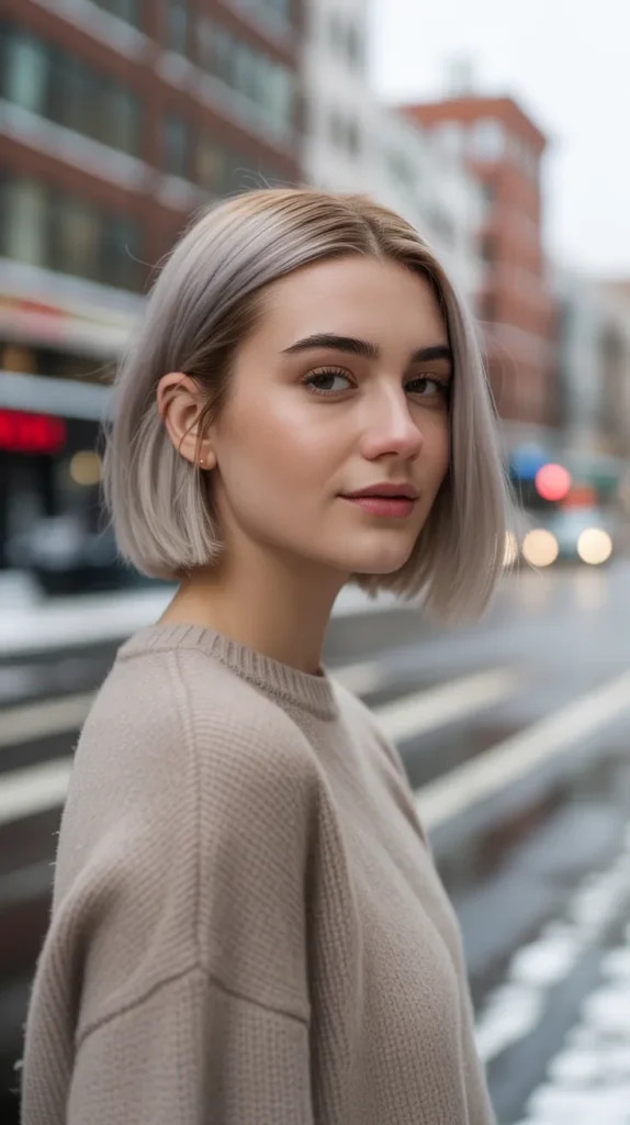 An icy platinum blonde bob is the ultimate cold hair color that screams winter chic. The chin-length cut keeps it sleek and trendy, making it perfect for showcasing sharp lines and a polished vibe. This shade reflects beautifully against snowy backdrops and cozy knits, giving you that frosted glow. If you’ve been craving a bold switch, this is one of those winter hair color ideas that instantly transforms your look. Pair it with a red lip and oversized coat, and you’re basically walking winter fashion inspo.