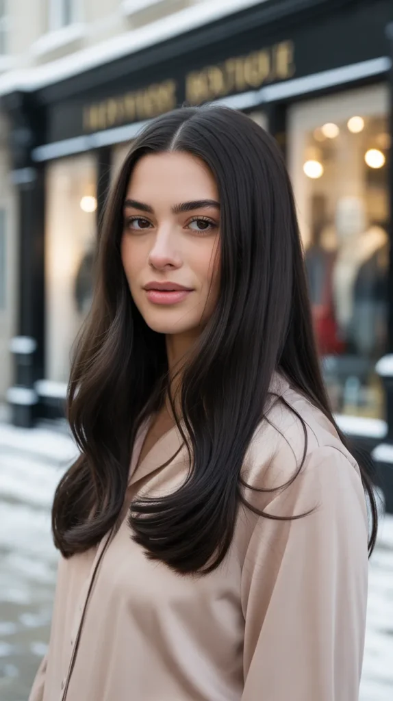 Jet black hair with a gloss finish is dramatic, sleek, and bold. This cold hair color shines beautifully, giving off a polished edge. It’s the kind of winter hair that never fails to make a statement. Whether worn straight or styled into waves, it exudes confidence. Pair it with bold winter coats and accessories for a look that’s powerful and timeless.