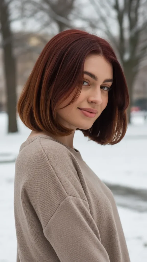 The mahogany brunette lob combines richness with a modern cut. Shoulder-length strands keep it stylish and easy to maintain, while the mahogany shade adds warmth. This winter hair color feels timeless yet trendy, perfect for work or weekend outings. It pairs beautifully with neutral winter wardrobes, adding just the right pop of color. A chic, polished option for anyone wanting a subtle refresh.