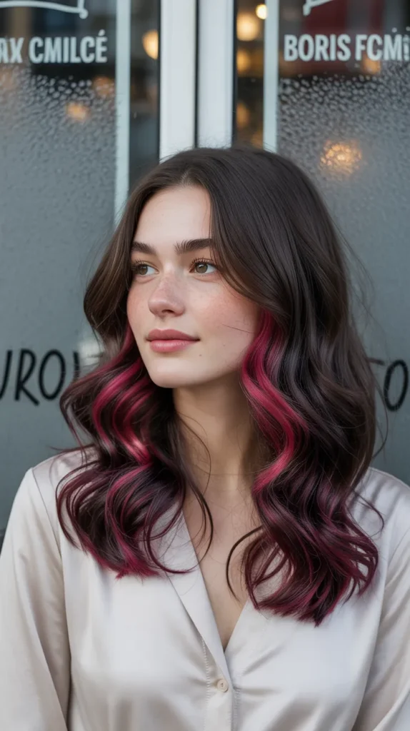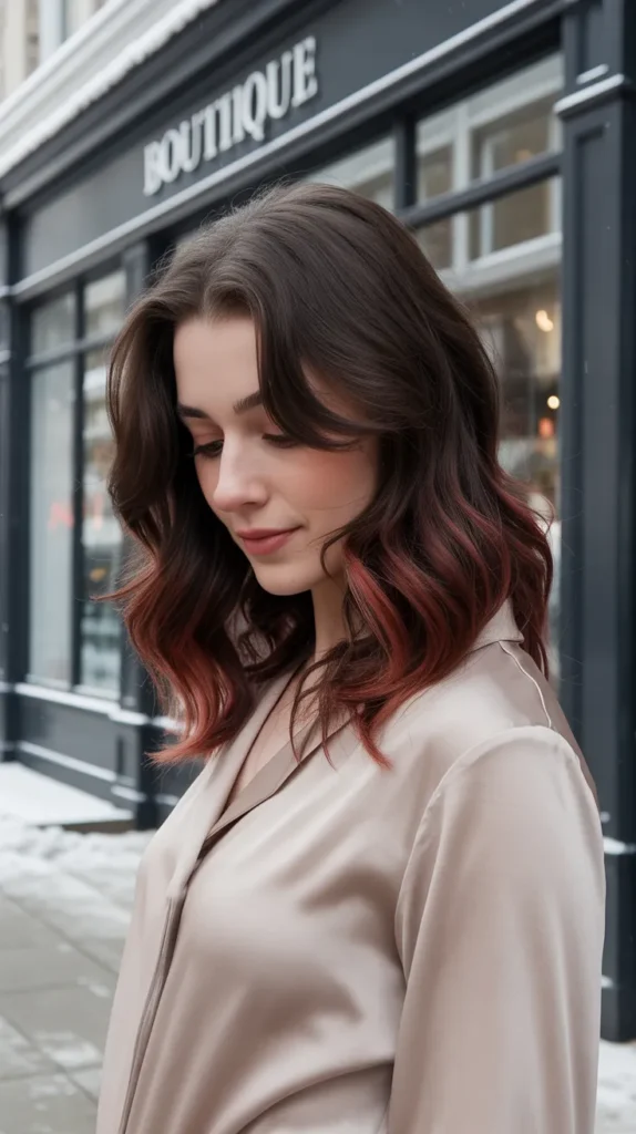Burgundy balayage highlights lift dark brunette bases with a bold pop of color. The red ribbons bring warmth and personality to winter hair. This style is perfect for those who love standing out but want a polished finish. Burgundy tones shine brightest in natural or festive lighting. It’s trendy, radiant, and full of flair for the season.
