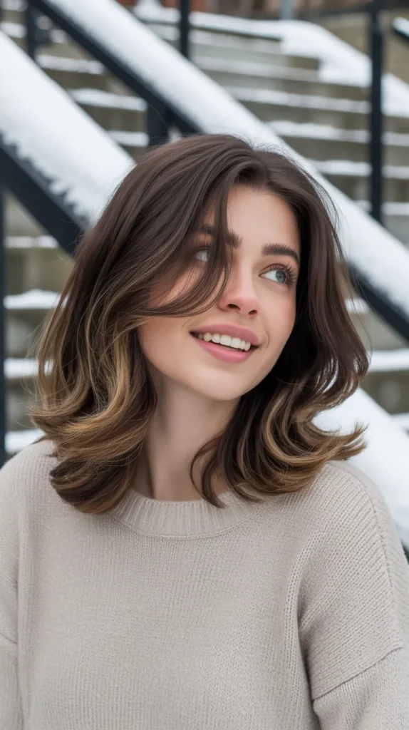Caramel balayage on a dark brunette base melts into soft, natural dimension. The warmth of caramel complements cozy winter outfits while keeping your look approachable. This style balances richness with playfulness, perfect for everyday wear. If you want winter hair that feels trendy but not too bold, this is your go-to. It’s versatile enough for both casual days and polished evenings.