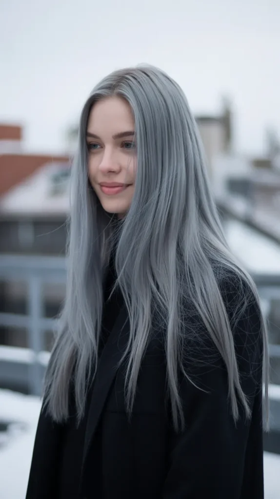 Silver frost shades make long hair look like an ice queen’s dream. This bold cold hair color is striking, elegant, and unapologetically trendy. The frosty tones glow under winter light, adding that ethereal vibe. Keep the strands sleek and straight for maximum impact. It’s perfect for making a statement at winter parties or festive celebrations.
