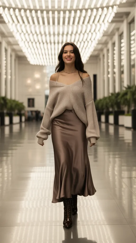 A satin maxi skirt with an off-shoulder sweater and heeled boots gives that cozy-meets-glam aesthetic every Pinterest board dreams of. It’s soft, romantic, and totally main character approved.