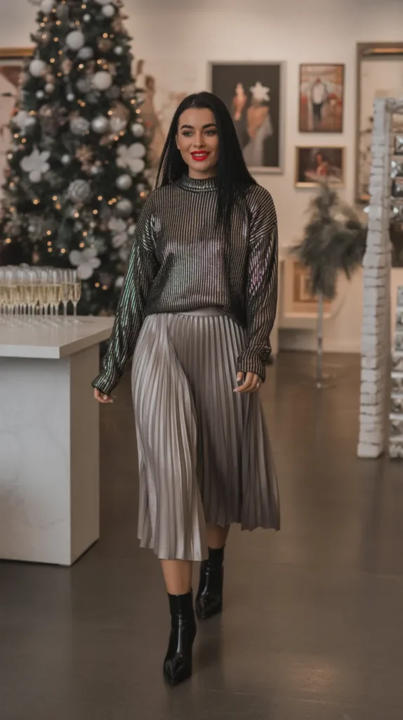 A metallic knit top tucked into a pleated midi skirt with ankle boots gives cozy-meets-festive energy. It’s that low-key glam look you can wear to a dinner party or casual celebration and still feel totally polished.