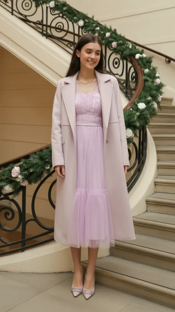 Float through the evening in a tulle midi dress layered under a longline coat with pumps. It’s feminine, elegant, and full of that whimsical charm that makes winter nights feel just a little more magical.