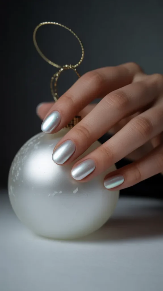 These pearly chrome nails shimmer like snow under moonlight. Theyβre elegant, luminous, and perfect for subtle winter nails shine. π€