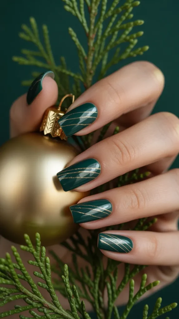 A forest-green base with fine gold striping gives perfect contrast. Itβs refined, modern, and an elevated way to wear xmas nails with class. πβ¨