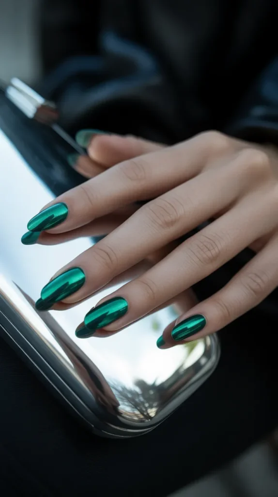 High-shine emerald chrome nails add an edgy twist to tradition. The metallic finish makes your winter nails feel sleek and modern perfect for bold holiday looks. π