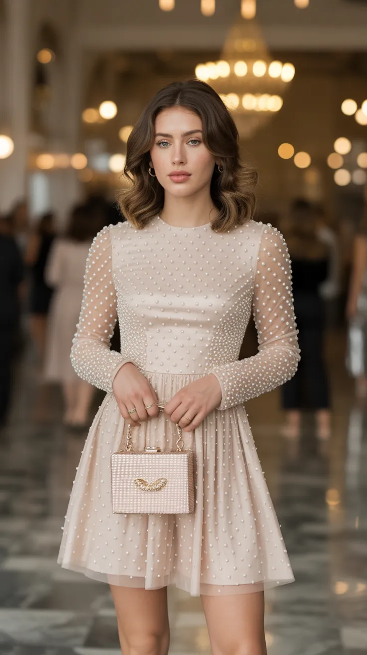 When thinking about birthday dress ideas for your 18th birthday, this look stands out. It’s simple, yet it makes a statement. You’ll feel confident and ready to celebrate this milestone in style. So, if you’re searching for 18th birthday outfit ideas, consider this pearl embellished dress with a mini bag for a look that pops!