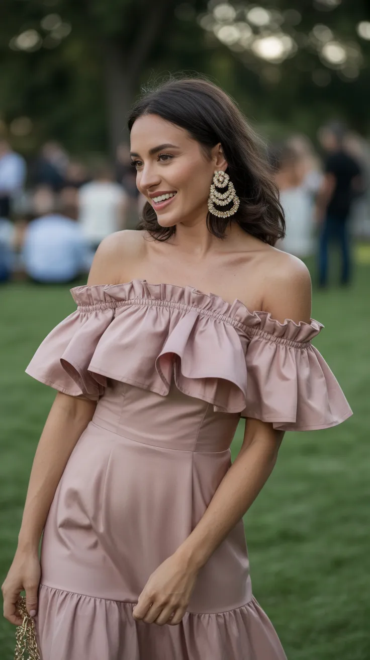 8. Off-Shoulder Ruffle Dress With Statement Earrings