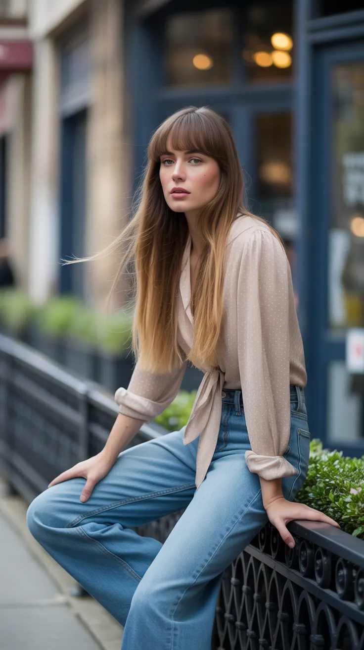 This look is not just nostalgic; it’s also versatile. You can style it with a bit of wave for a more bohemian feel or keep it sleek for a polished look. The curtain bangs are flattering for many face shapes, making it a popular choice among many.
