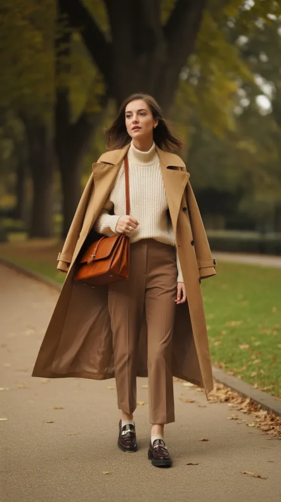 When it comes to 2025 autumn outfits, nothing feels more timeless than the combination of camel and cream. π A classic camel trench coat layered over a cream knit sweater instantly creates that girl next door style that looks effortless yet polished. Brown tailored trousers anchor the look, giving it just enough structure for casual workdays or weekend strolls. The warm tones bring out autumnβs cozy charm without being too overpowering. Loafers add a touch of chic simplicity, and a leather satchel ties everything together in a practical way. This is the kind of outfit that transitions easily from morning coffee runs to an evening dinner out. Plus, itβs a versatile base that you can dress up or down depending on your mood. Add a silk scarf if you want a pop of color, or keep it minimal for understated chic. β¨