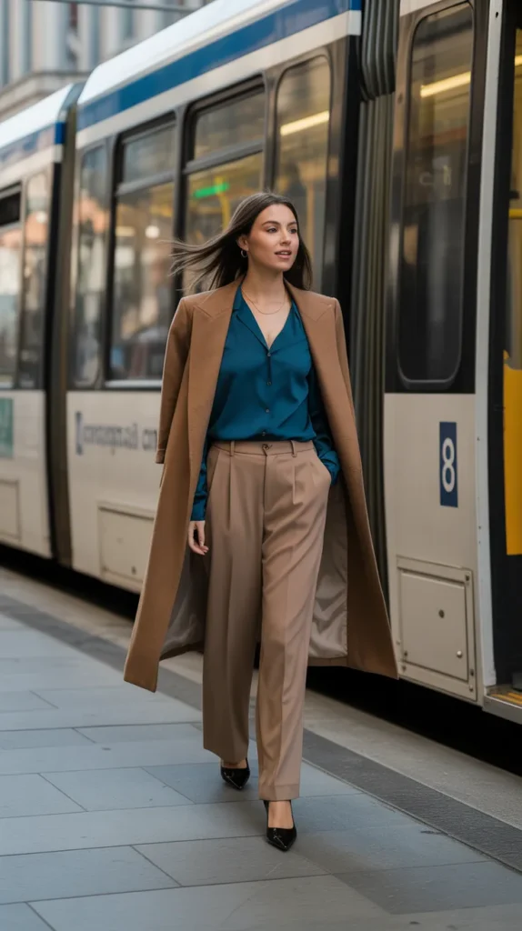For a more elevated professional look, deep teal is a color worth embracing. π A teal blouse paired with camel wide-leg trousers creates a stylish, unexpected color combo. Add pointed-toe pumps to elevate the outfit even more. This is the kind of 2025 autumn outfit that feels powerful yet approachable. The deep teal shade ties in beautifully with fallβs earthy tones while still offering a fresh pop of color. Accessories like a gold watch or subtle hoops add refinement. A trench or blazer works perfectly if you need layering. Itβs a polished take on autumn style that blends workwear with seasonal flair. Girl next door meets confident professional the best of both worlds.