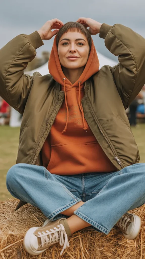 Weekends are for comfort, and a rust-orange hoodie layered under a brown bomber jacket delivers just that. π Pair it with relaxed jeans and sneakers for a no-fuss outfit. The earthy rust tone is perfectly seasonal and makes casual dressing look intentional. Itβs laid-back but still cute, embodying the girl next door style effortlessly. A crossbody bag or a cap can add personality. This is a 2025 autumn outfit thatβs practical yet stylish enough for grabbing brunch or strolling through the park. Comfort is king here, but the warm color palette ensures you still look chic.