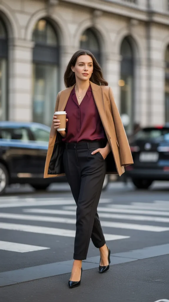 When office days call for something stylish yet professional, a fitted burgundy blouse paired with black trousers is a perfect choice. The deep burgundy shade ties seamlessly into autumn style, offering richness and warmth without being too bold. Pairing it with a camel blazer softens the look, keeping it polished yet approachable. Add block heels for a finishing touch thatβs practical for work yet chic enough for after-hours dinner. Burgundy also gives off a confident vibe, making this outfit perfect for presentations or important meetings. Accessories like a gold necklace or stud earrings add just the right amount of shine. This look proves business casual doesnβt have to be boring you can still embrace 2025 autumn outfits that feel professional but stylish. π· With the right balance of structure and softness, it delivers that modern girl next door style at work.