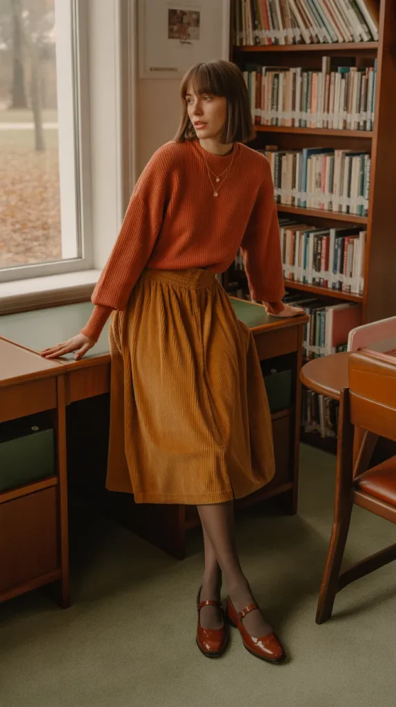 Nothing screams autumn more than a cozy knit sweater paired with corduroy. π A burnt orange knit tucked into a golden-brown corduroy skirt feels fun, warm, and seasonal. Add tights to keep cozy as temperatures drop and Mary Jane flats for a retro-inspired finish. This combo perfectly blends cute outfits with chic seasonal textures. Corduroy skirts are versatile dress them up with boots for a dinner date or keep it casual with sneakers for everyday wear. The rich earthy tones highlight why 2025 autumn outfits feel so comforting yet trendy. A crossbody bag in a matching shade ties the whole outfit together. Whether youβre heading to brunch with friends or enjoying a day out, this look captures the heart of girl next door style with a touch of vintage charm.