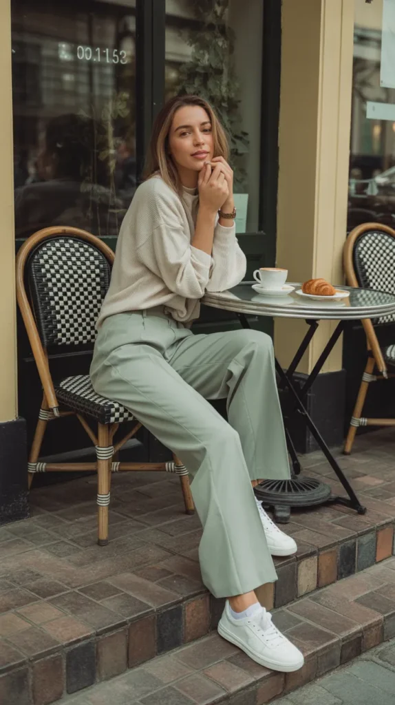 Sage green continues to shine as a trend color in 2025 autumn outfits. Pairing sage wide-leg trousers with a muted ivory knit top creates an outfit thatβs calm yet chic. π€ White sneakers keep it casual, perfect for everyday errands or coffee meetups. The soft tones lean into girl next door style, offering an approachable vibe thatβs still fashion-forward. What makes sage so appealing is its versatility it pairs beautifully with creams, browns, and even blush tones. Add a crossbody bag or a longline coat for extra warmth. This outfit shows that autumn style doesnβt have to be dark or heavy soft colors can feel just as seasonal. The result is effortless comfort paired with understated elegance. Itβs proof that cute outfits can still be polished without trying too hard.
